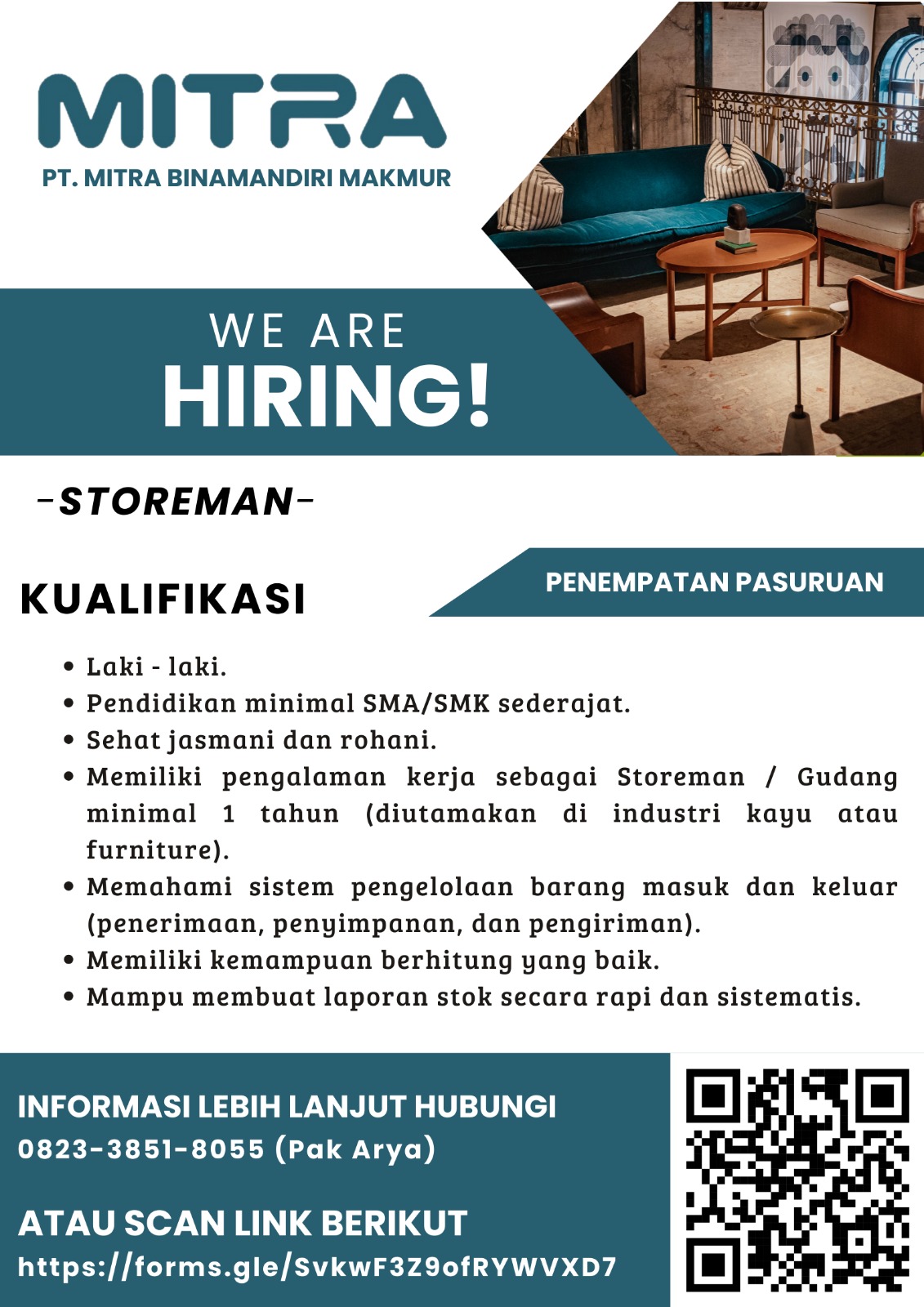 Pengalaman storeman / gudang min 1 tahun diutamakan di industri kayu atau furniture. Memahami sistem pengelolahan barang masuk dan keluar (penerimaan, penyimpanan dan pengiriman. Memiliki kemampuan berhitung yang baik. Mampu membuat laporan stok secara rapi dan sistematis. Hub. Pak Arya 082338518055